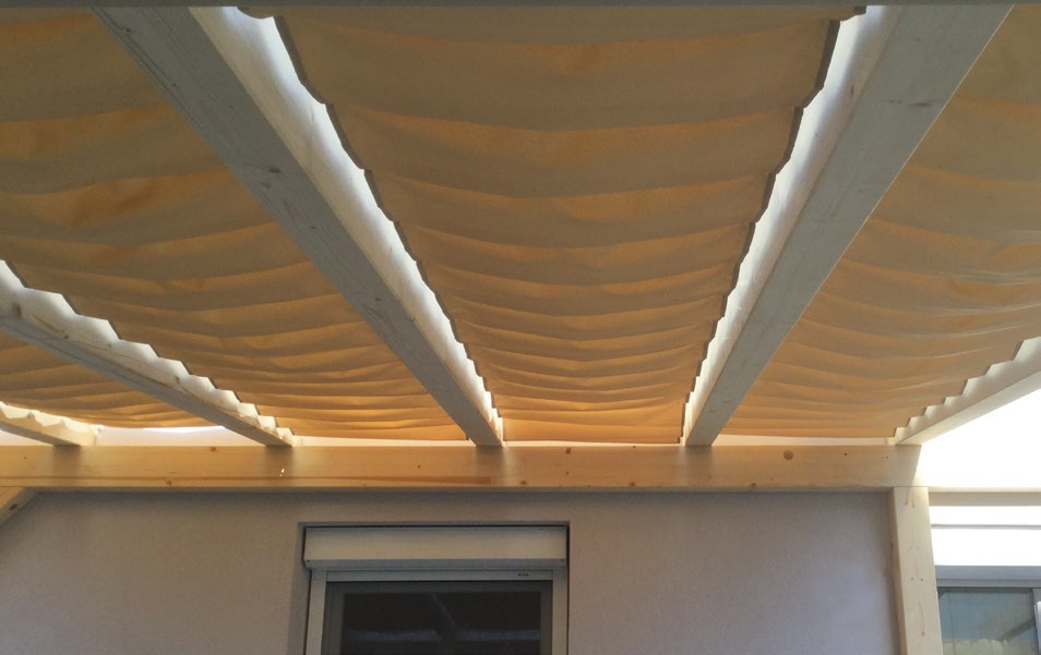 Flexibler Sonnenschutz für Pergolen; jedes Sparrenfeld ist einzeln bedienbar.