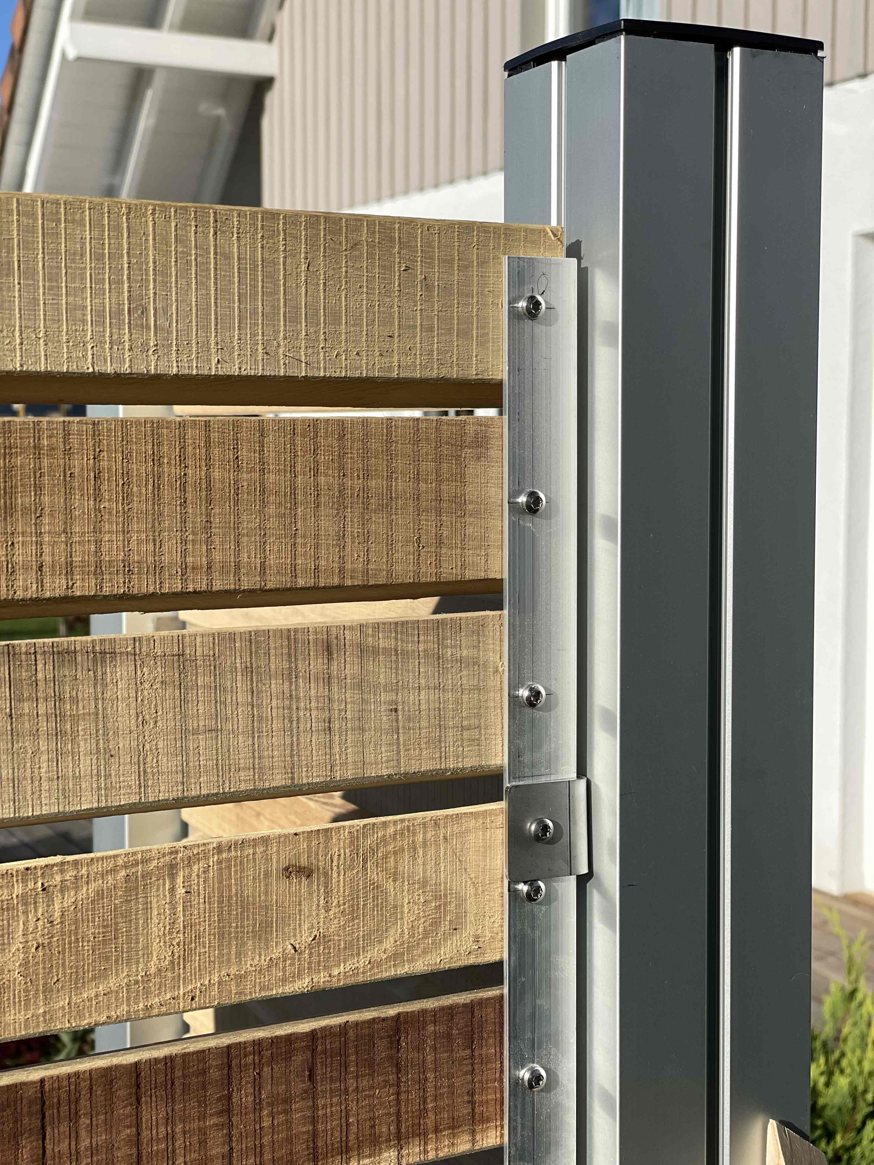 Die Befestigung erfolgt mit Edelstahl-Winkeln an passenden Pfosten, idealerweise aus